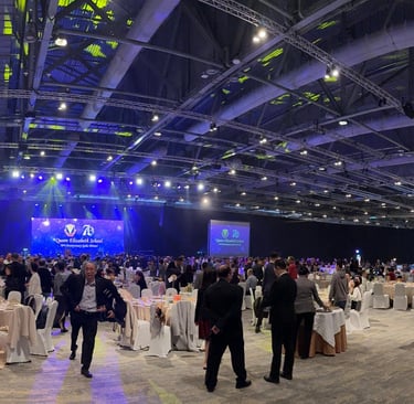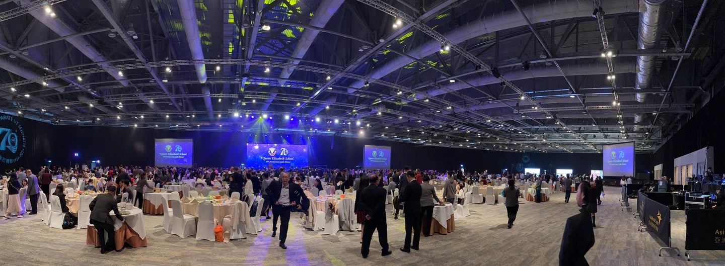 在筵開八十多席的會館,最矚目的便是臺上投射出 Queen Elizabeth School 70th Anniversary Gala Dinner的大銀幕,還有坐席二十人的超大圓形主桌。